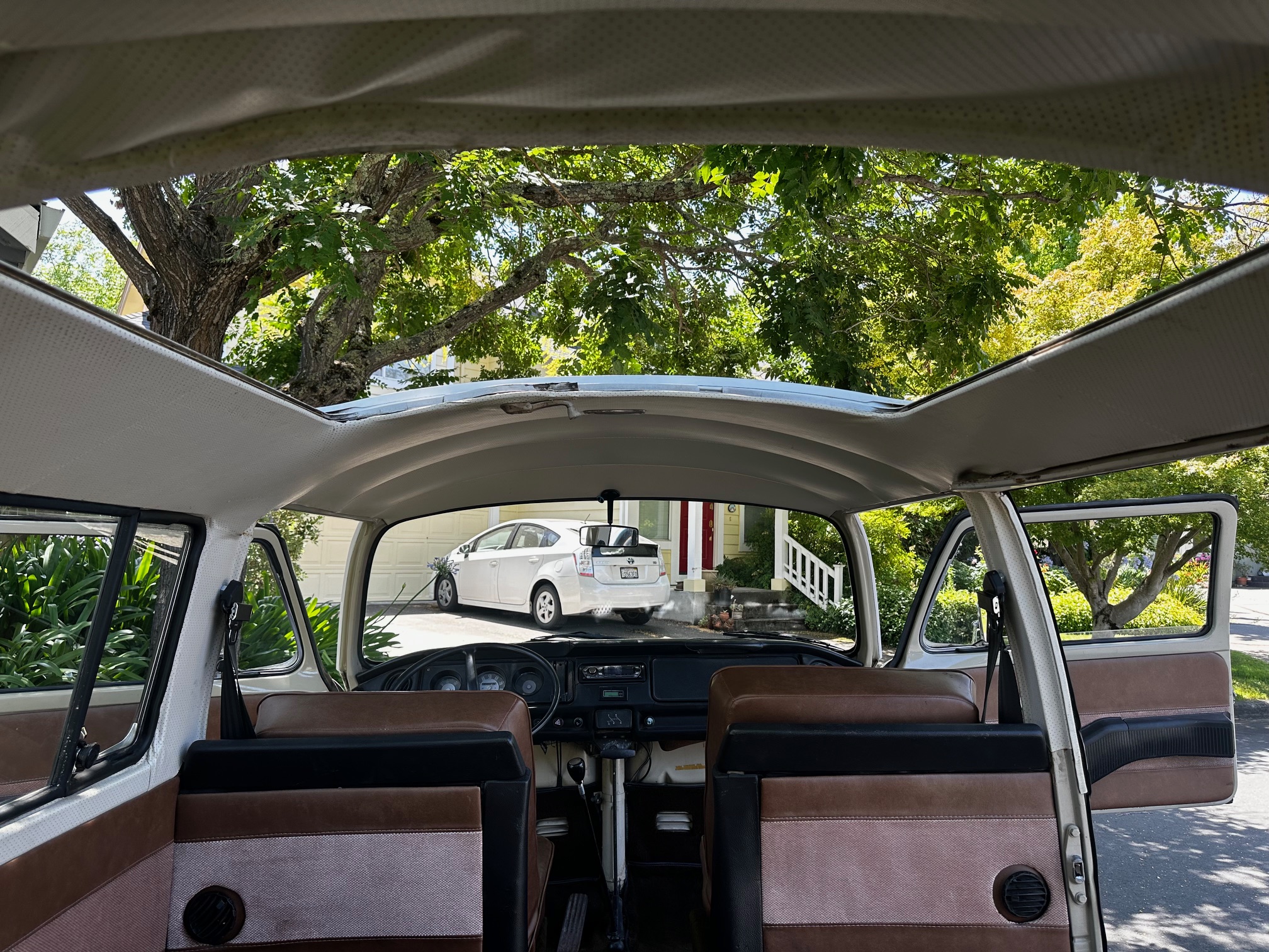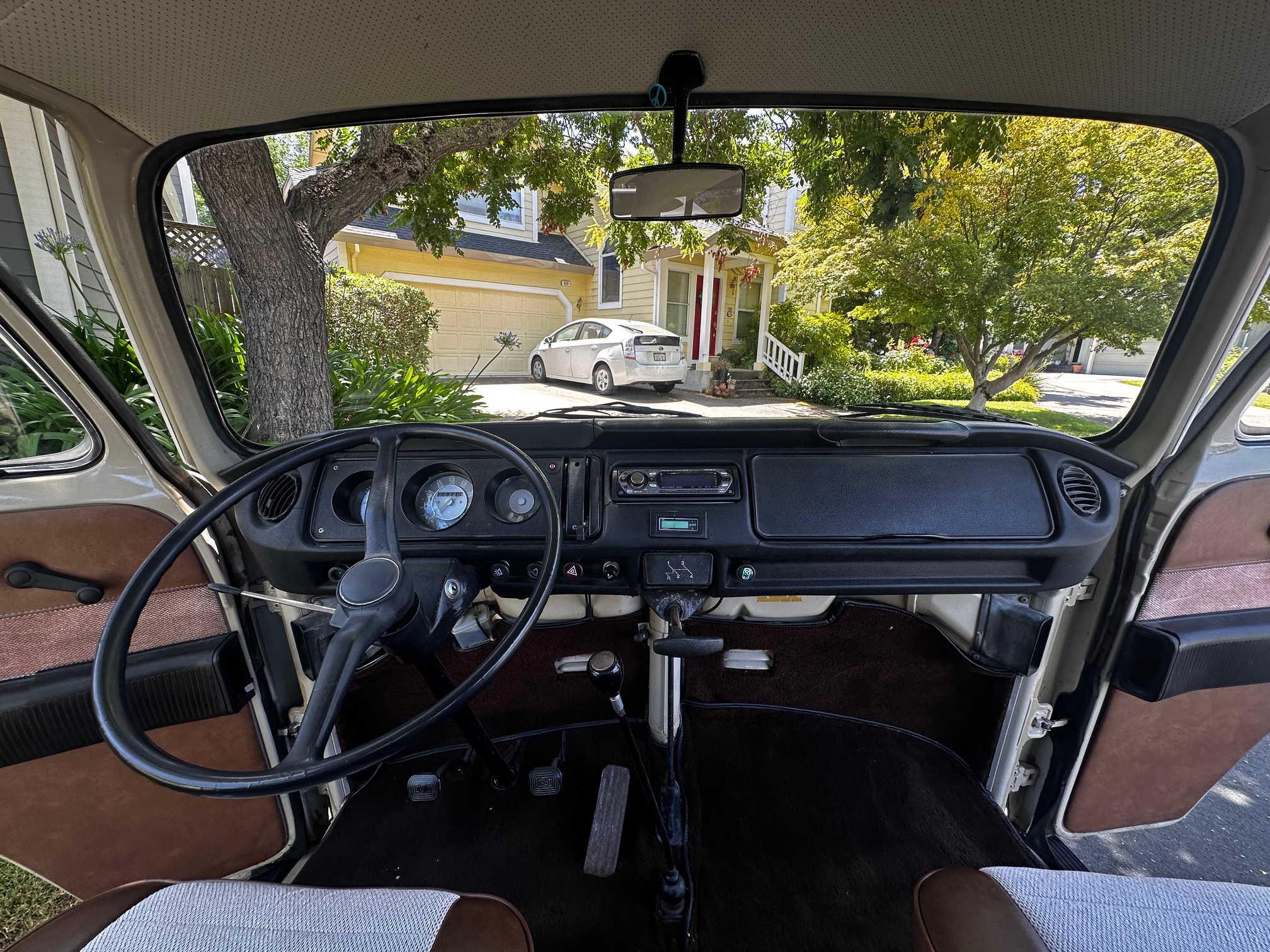 The fuel gauge does not work. The passenger door lock is missing. Some of the knobs on the dash are missing. The driver door window is a little bit clunky to rollup but it does work. Recently the bus was parked backed in with the one pointing down hill and during the rains, there was some water that drained off the gutter rail into the front floor of the car. Not exactly sure where it was coming from.